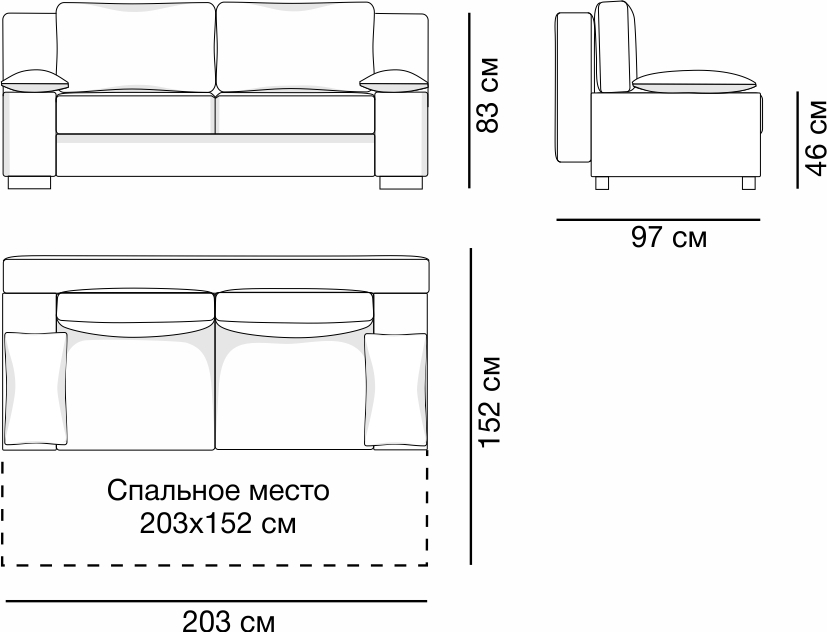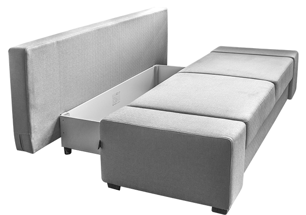 Austin will complement a room of modest size. The model does not feature elbow rests. The eurobook transformation mechanism unfolds a 203 x 152 sleeping place. Two "Austin" accent pillows complement the two massive back cushions. The sofa conceals a storage unit underneath the seat. The frame is made from solid timber. All cushion components are filled with ST3040 premium foam.